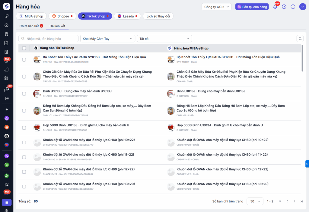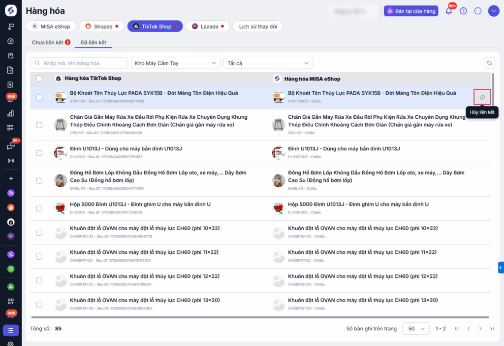 Chuyển sang tab Đã liên kết để kiểm tra toàn bộ danh sách sản phẩm đã được ghép nối thành công giữa Tiktok Shop và MISA eShop.