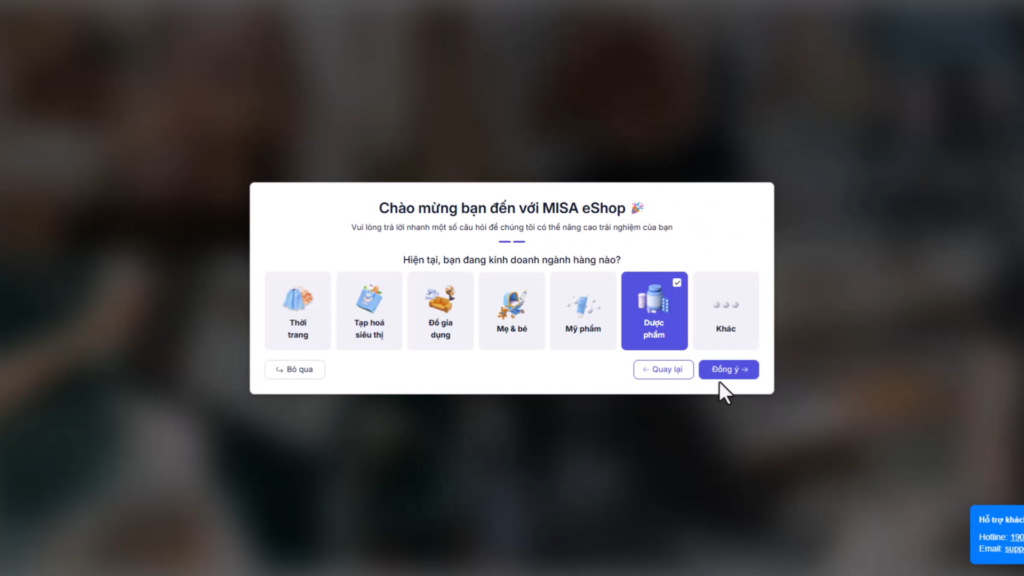 Đăng ký tài khoản MISA eShop, tại màn hình chọn ngành hàng, nhấn chọn Dược phẩm, nhấn Đồng ý.