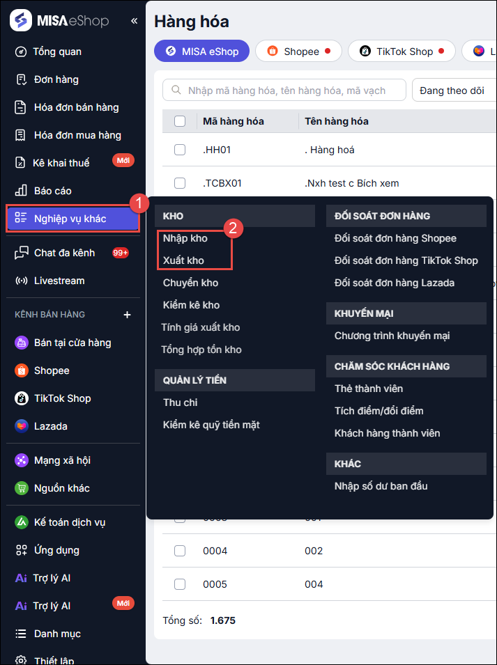 Nhấn chọn Nghiệp vụ, chọn Nhập kho hoặc Xuất kho, và thực hiện thêm mới.