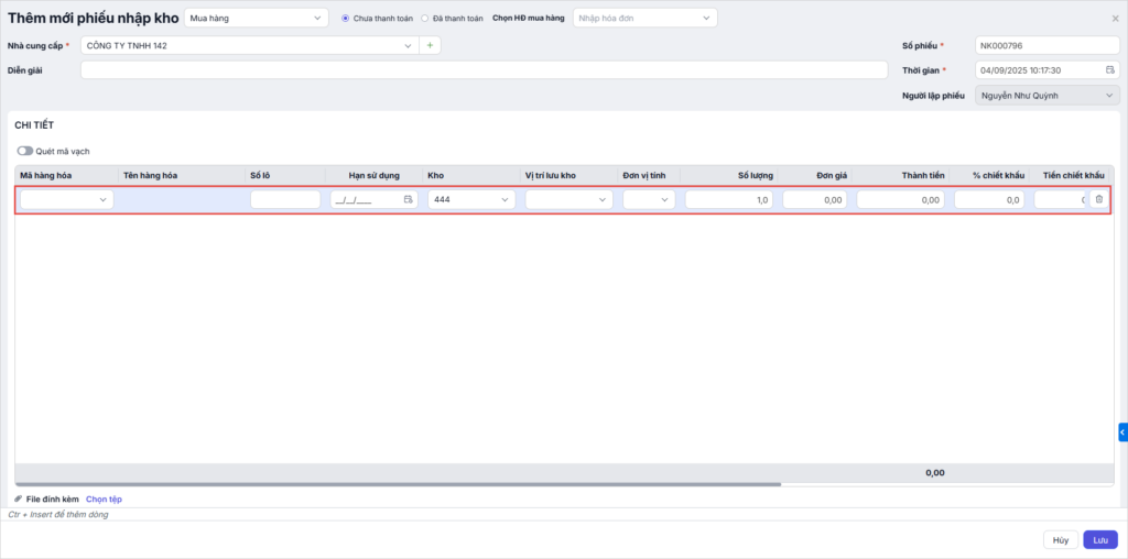 Bước 2. Nhập thông tin và lưu chứng từ