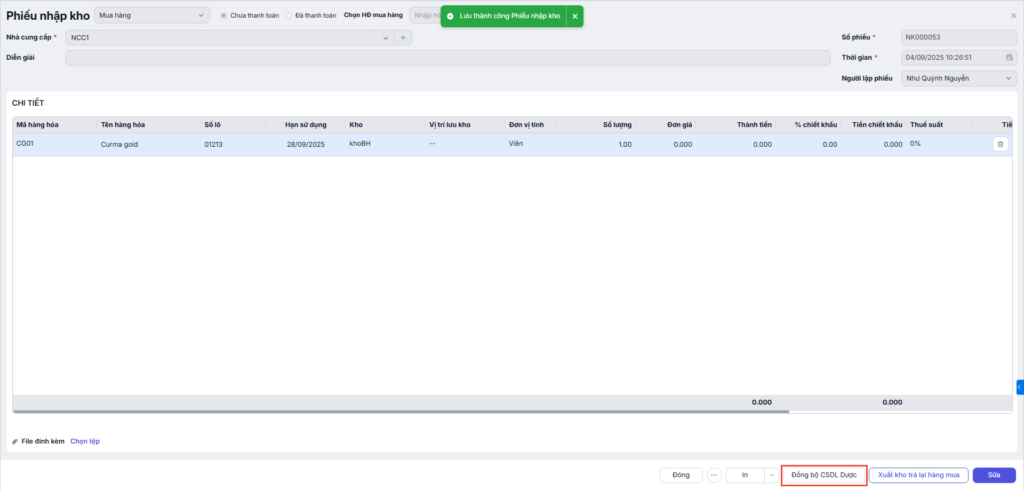Nhập đủ thông tin cần thiết, nhấn Lưu. Nếu bật chế độ tự động đồng bộ, phần mềm sẽ tự gửi dữ liệu lên CSDL Dược.