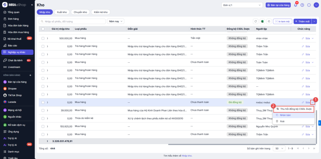 - Chỉ những phiếu nhập hoặc xuất có chứa mặt hàng là thuốc thì mới được phần mềm đồng bộ lên Cơ sở dữ liệu Dược quốc gia.