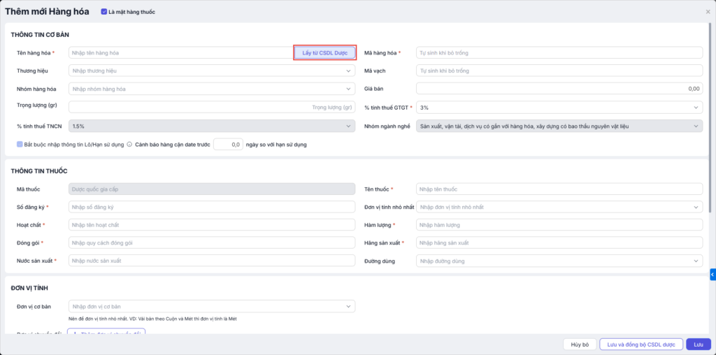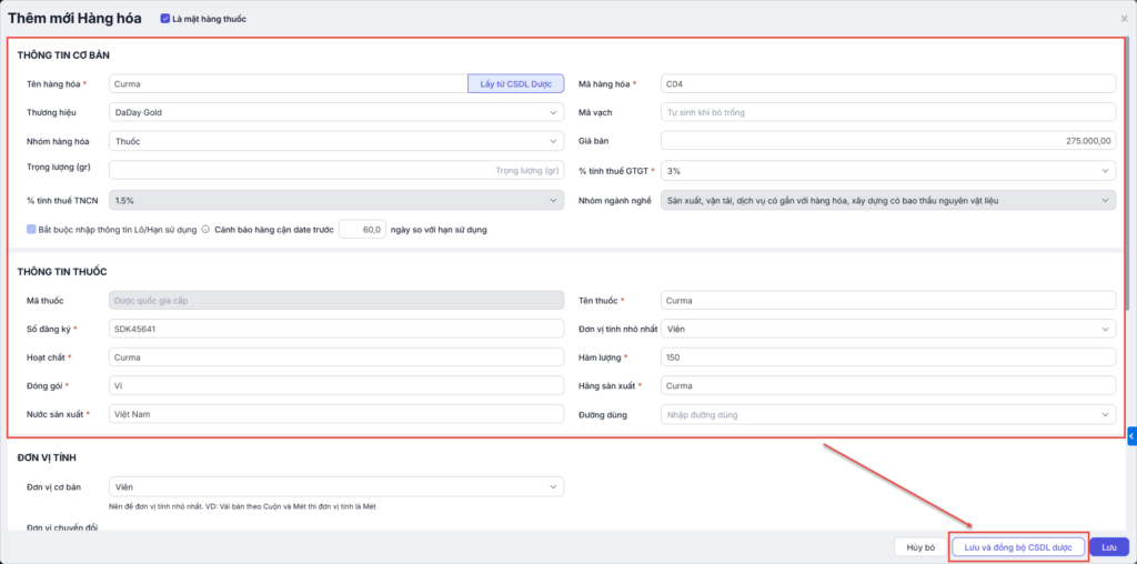 - Nếu thuốc chưa có trên CSDL Dược, nhập đầy đủ thông tin thuốc. Nhấn Lưu và Đồng bộ lên CSDL Dược hoặc chỉ cần nhấn Lưu nếu đã bật chế độ tự động đồng bộ.