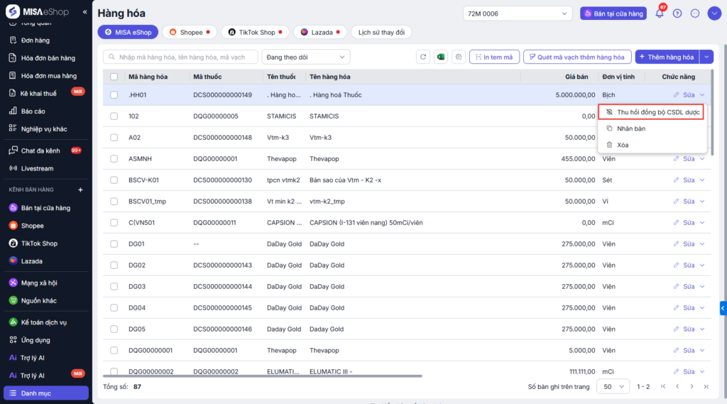 - Bán tại cửa hàng: Các đơn bán trực tiếp sẽ tự động lên CSDL Dược.