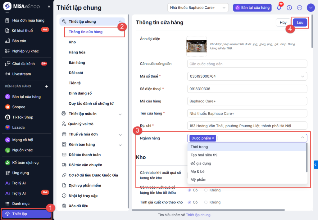 Cửa hàng chưa phải là ngành hàng Dược có thể bổ sung hoặc thay đổi ngành hàng để thực hiện kết nối. Vào Thiết lập > Thiết lập chung > Thông tin cửa hàng > Tại Ngành hàng > Chọn Dược Phẩm > Lưu.