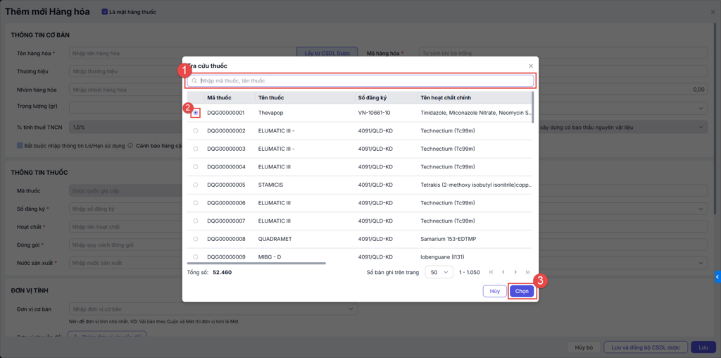 Tìm kiếm và chọn đúng thuốc cần thêm. Nhấn Chọn.