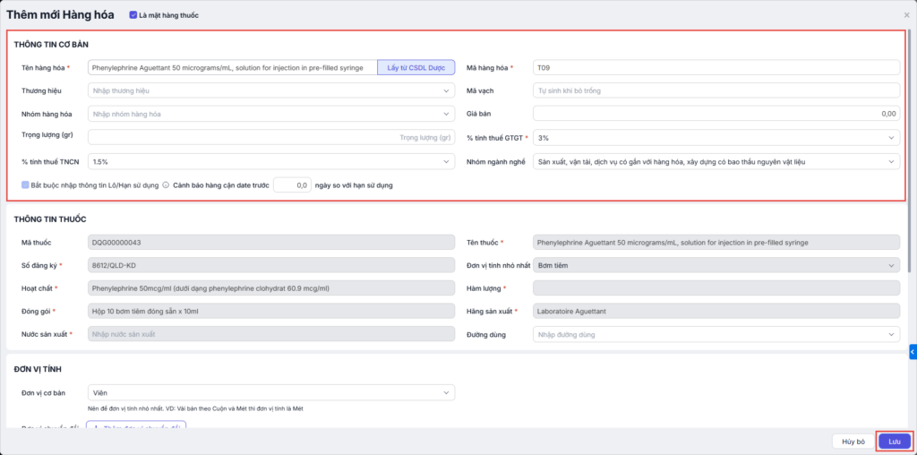 Nhập thông tin cơ bản của hàng hóa. Nhấn Lưu để hoàn tất.