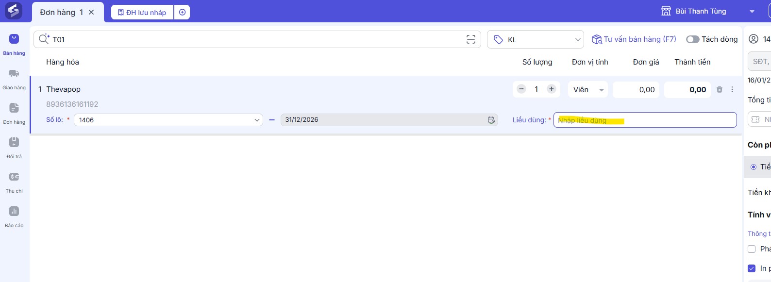 Tương tự cách tạo đơn bán tại cửa hàng của hàng hóa thông thường. Lưu ý: khi tạo đơn bán hàng hóa thuốc, bắt buộc nhập Liều dùng của thuốc.