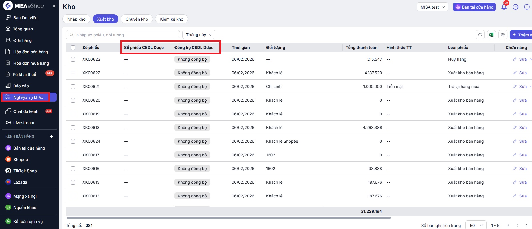 - Đối với cửa hàng không buôn bán hàng hóa là thuốc. Có thiết lập Ngành hàng: Dược phẩm. Xem danh sách phiếu xuất/nhập sẽ có cột Đồng bộ CSDL Dược, đồng bộ thành công sẽ có Số phiếu CSDL Dược. Nếu đơn vị không đồng bộ, không theo dõi có thể thiết lập ẩn cột.