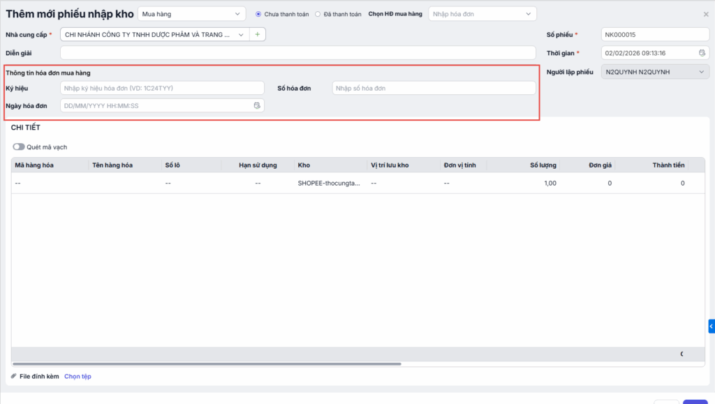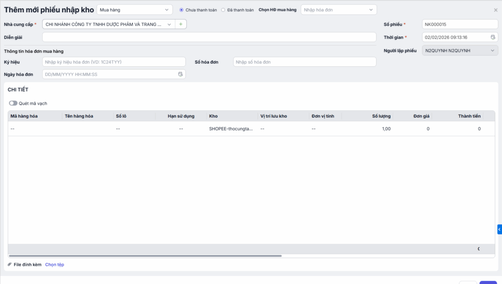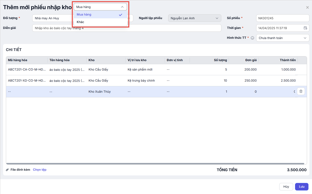 - Kho: Chọn kho để lưu trữ hàng hóa nhập về.