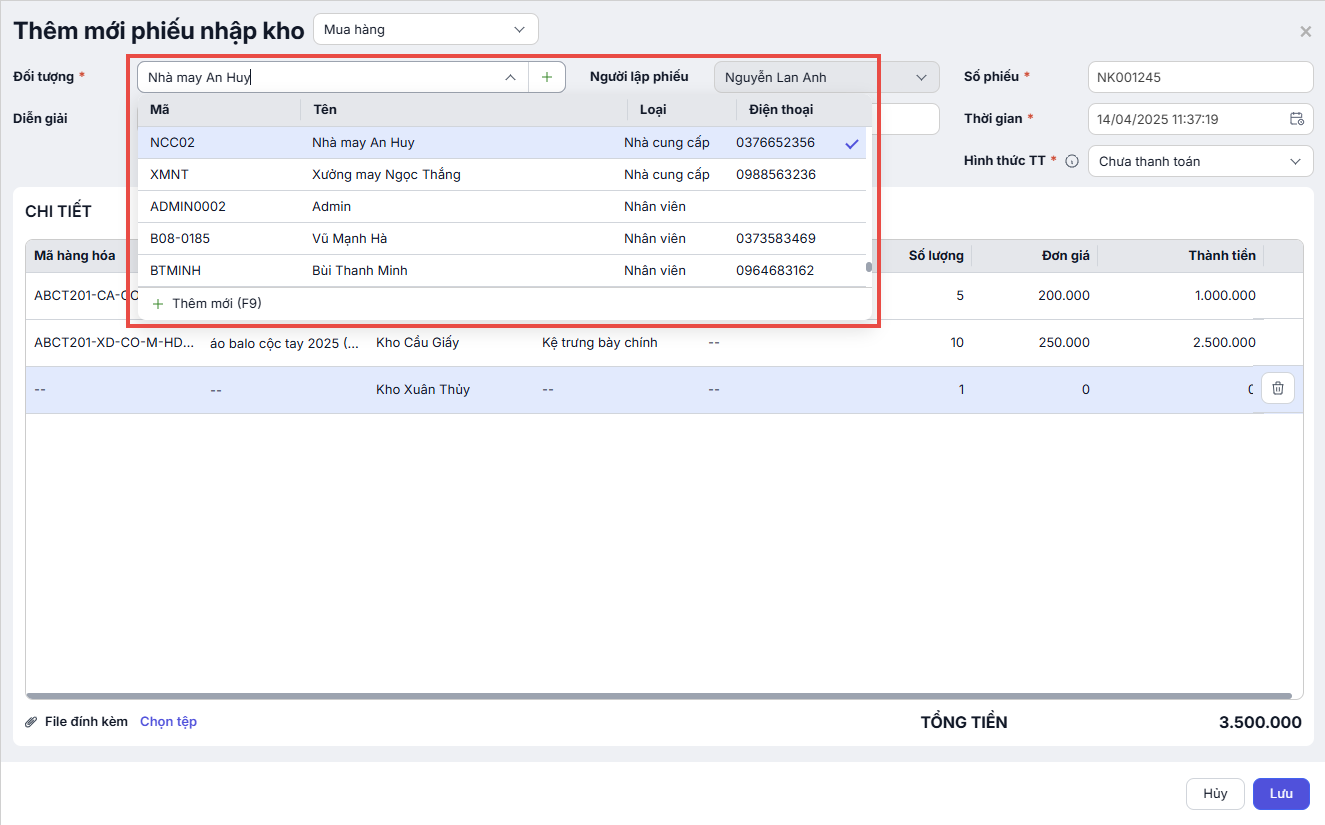 - Người nhập: Mặc định để là người đang tạo phiếu.