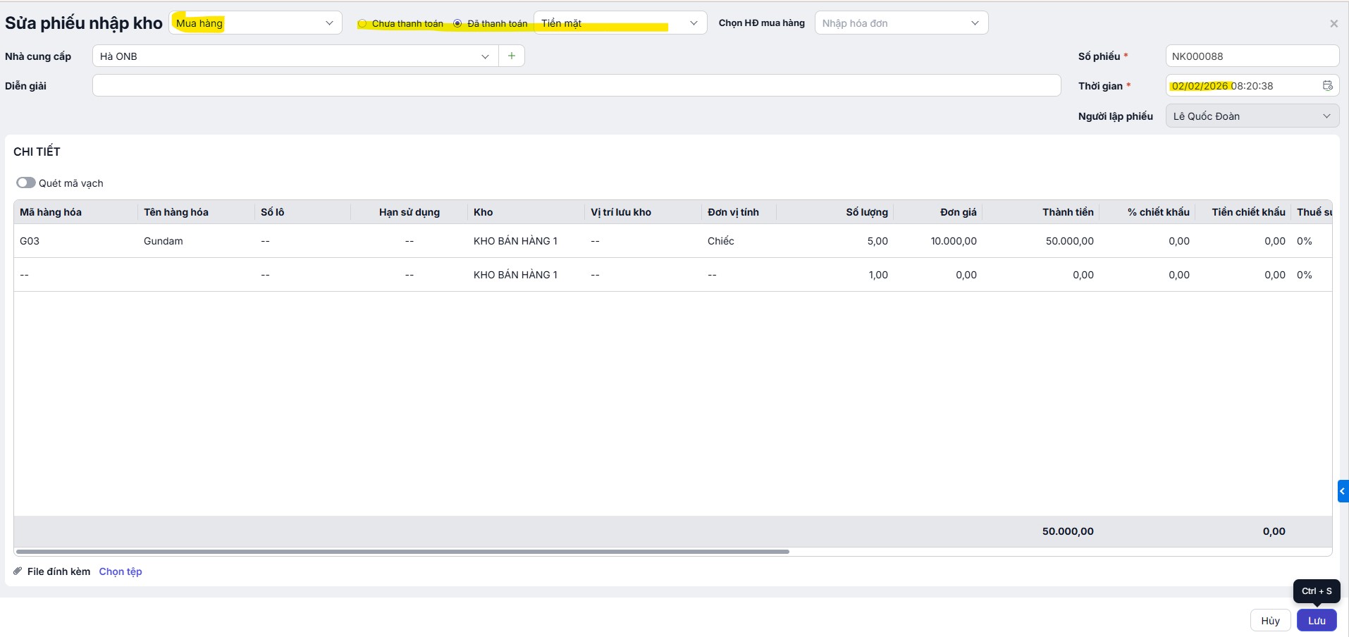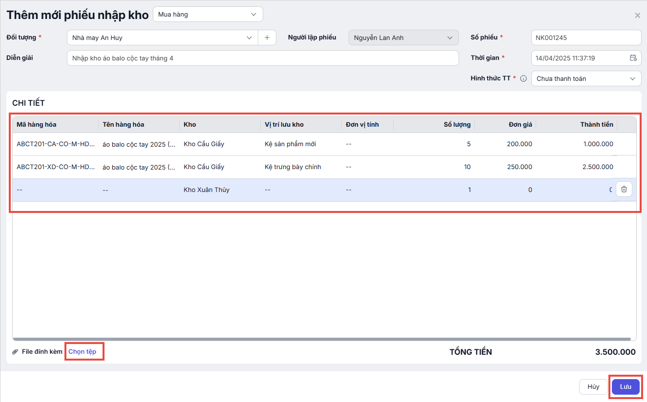 - Nhấn Lưu để hoàn tất tạo phiếu nhập kho.