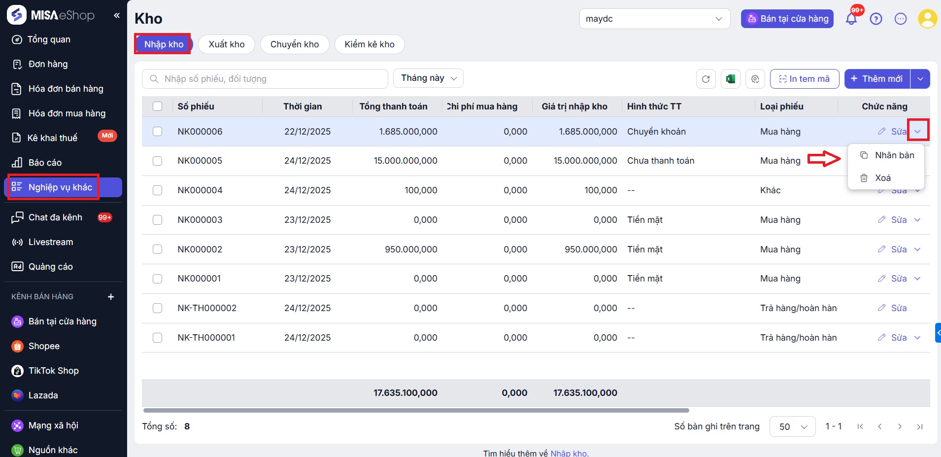 Truy cập Nghiệp vụ khác > Nhập kho > Tại Danh sách các phiếu nhập kho > Cuối từng dòng Phiếu nhập > Tích mũi tên cạnh chữ Sửa > Chọn Nhân bản.