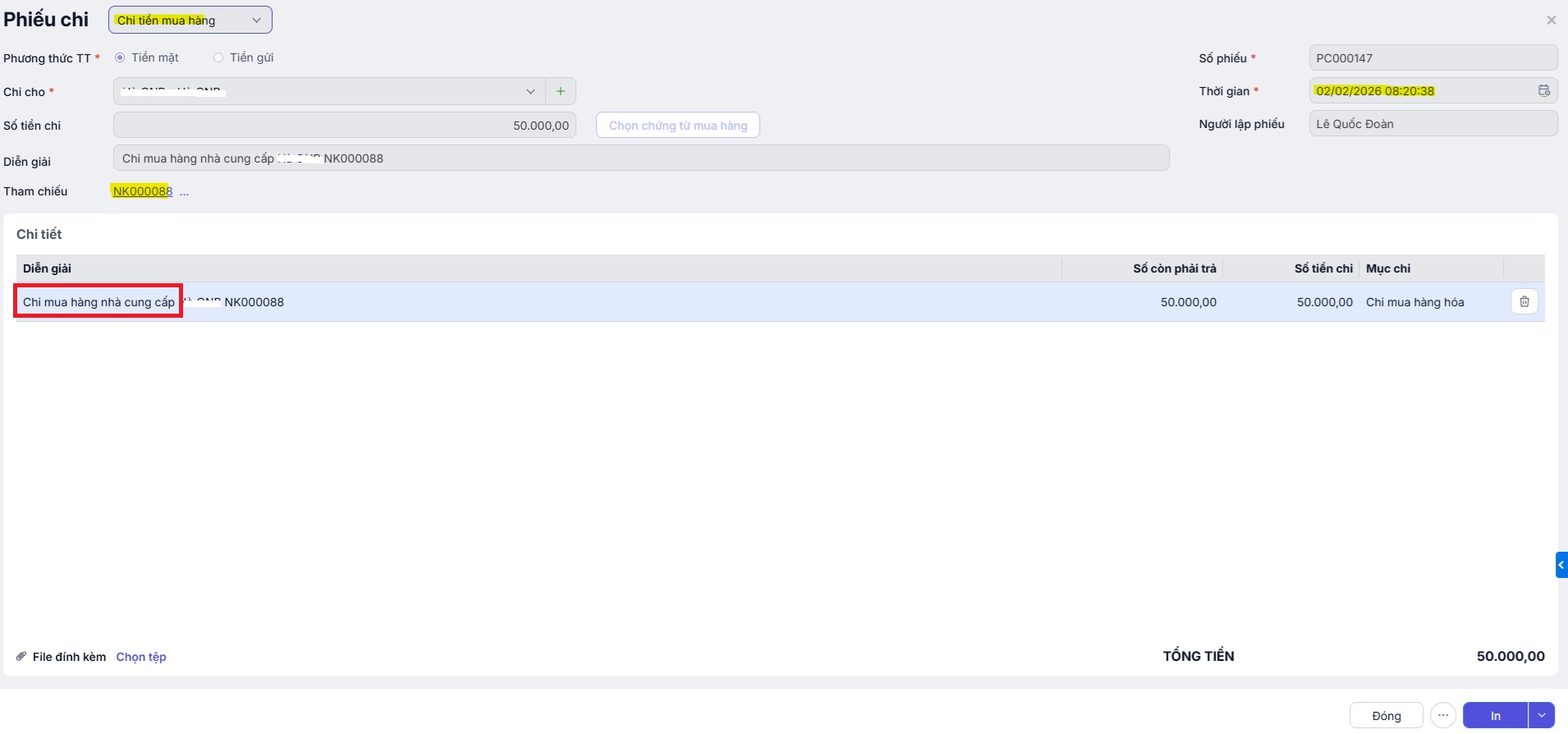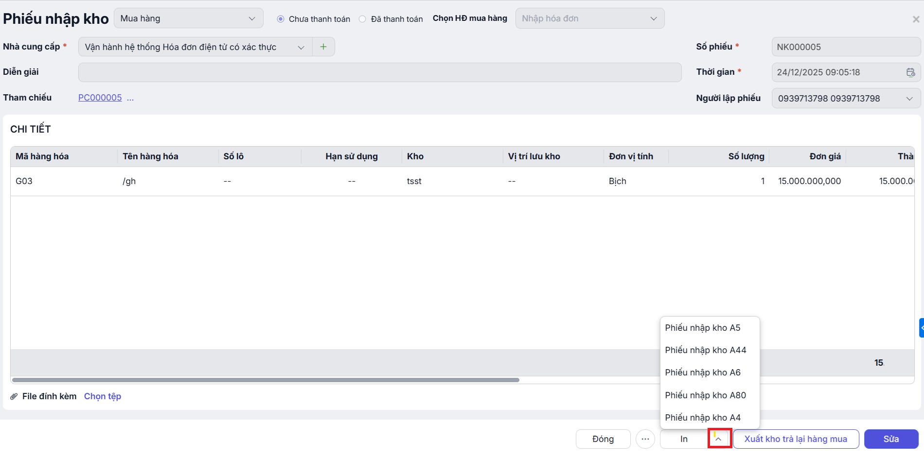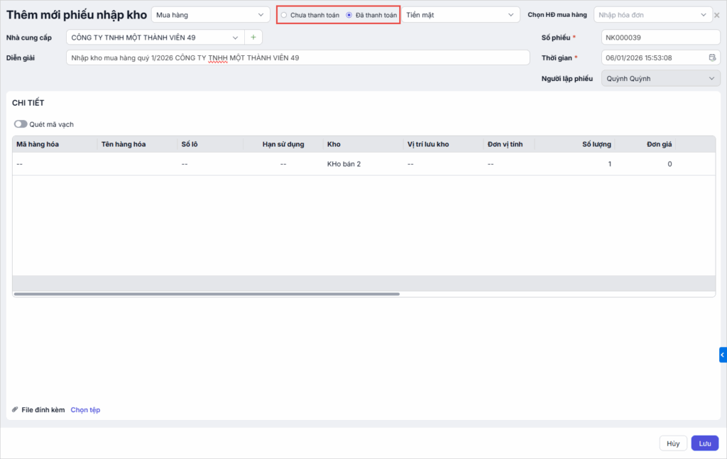 - Trường hợp phiếu nhập kho ở trạng thái Chưa thanh toán: Khi phát sinh chi trả thực , người dùng chủ động lập phiếu chi riêng hoặc bù trừ nợ với nhà cung cấp.