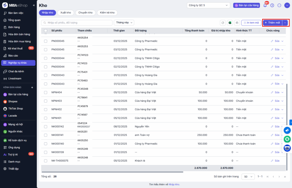 - Nhấn nút “Thêm mới” ở góc phải màn hình danh sách. Hệ thống sẽ mở giao diện tạo mới phiếu nhập kho.