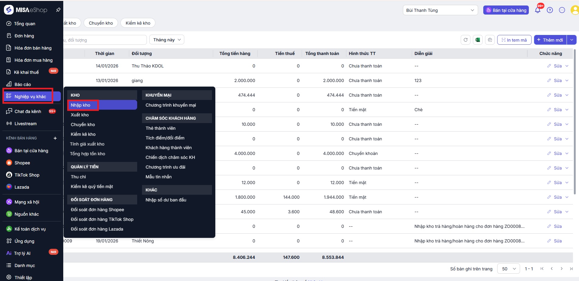 - Trên thanh menu bên trái chọn mục Nghiệp vụ khác → chọn Nhập kho.