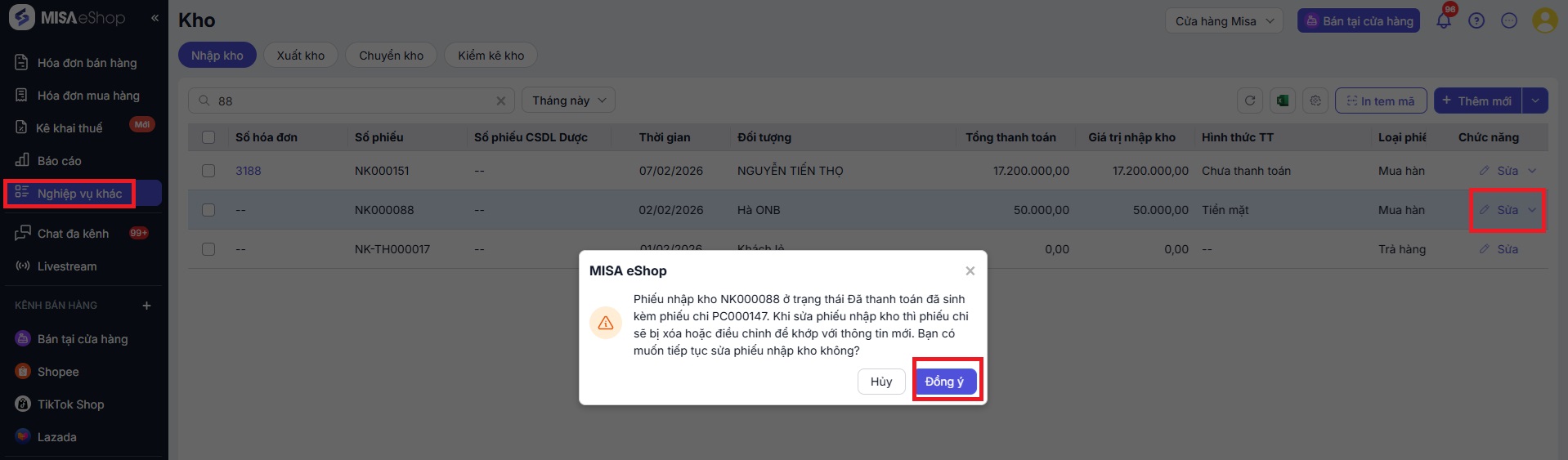 - Phần mềm cảnh báo: Phiếu nhập kho NK0000… ở trạng thái Đã thanh toán đã sinh kèm phiếu chi PC000…. Khi sửa phiếu nhập kho thì phiếu chi sẽ bị xóa hoặc điều chỉnh để khớp với thông tin mới. Bạn có muốn tiếp tục sửa phiếu nhập kho không?