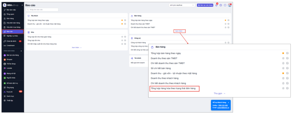 Vào Báo cáo, tại phần Bán hàng, chọn Tổng hợp hàng hóa theo trạng thái đơn hàng