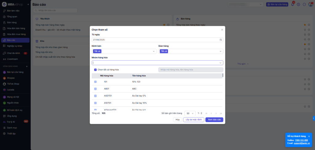 - Hàng hóa: Chọn tất cả hoặc các mặt hàng cần kiểm tra.