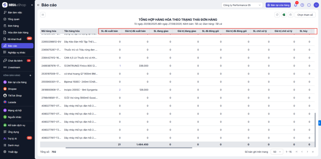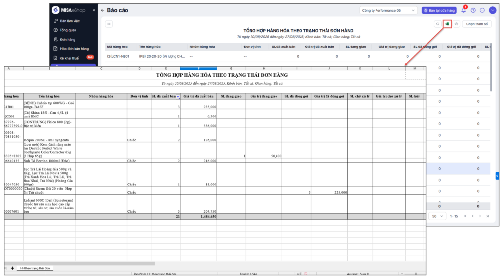 Khi đó, sẽ xem được Tổng hợp hàng hóa theo trạng thái đơn hàng của từng mặt hàng.