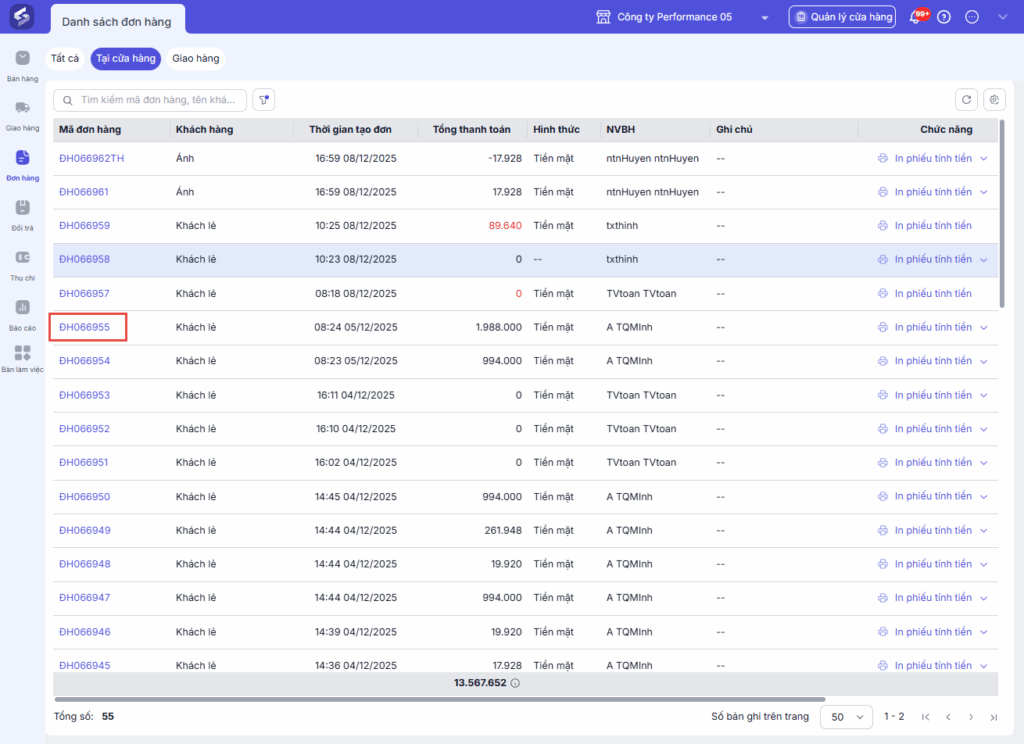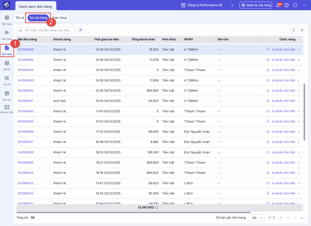 Tại trang Bán tại cửa hàng (POS), chọn Đơn hàng > Chọn Tại cửa hàng.