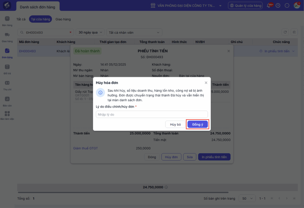 Bước 4: Nhập lý do hủy, nhấn Đồng ý để hoàn tất.