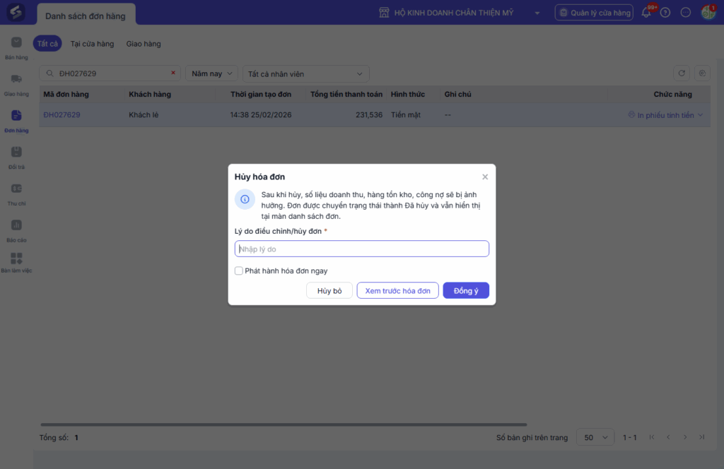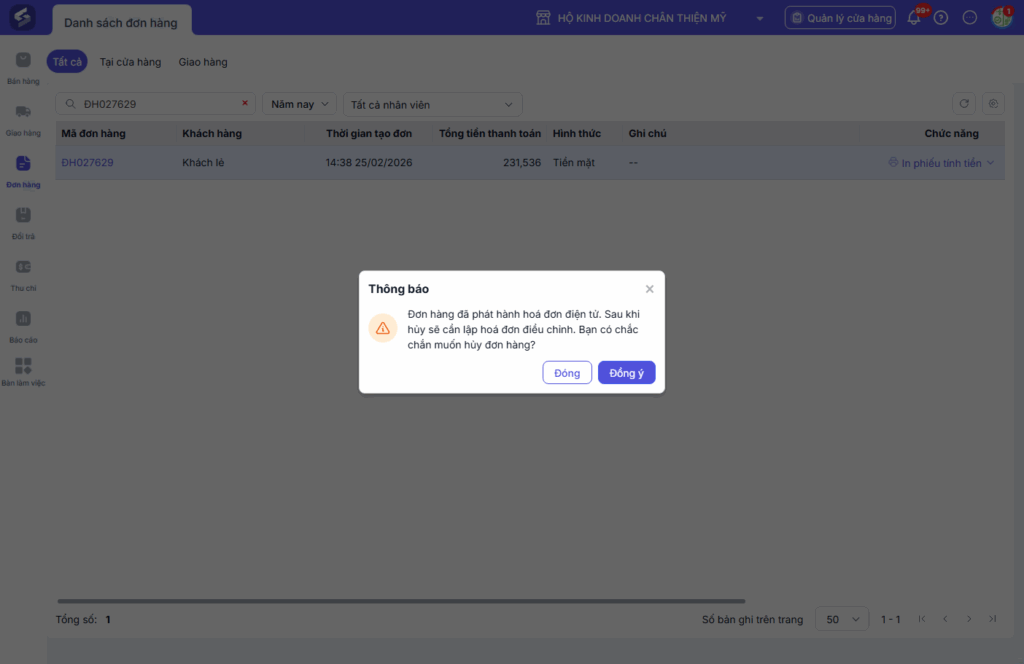 - Hệ thống hiện cảnh báo đơn hàng đã phát hành khi hủy đơn sẽ cần lập hóa đơn điều chỉnh -> Nhấn Đồng ý.