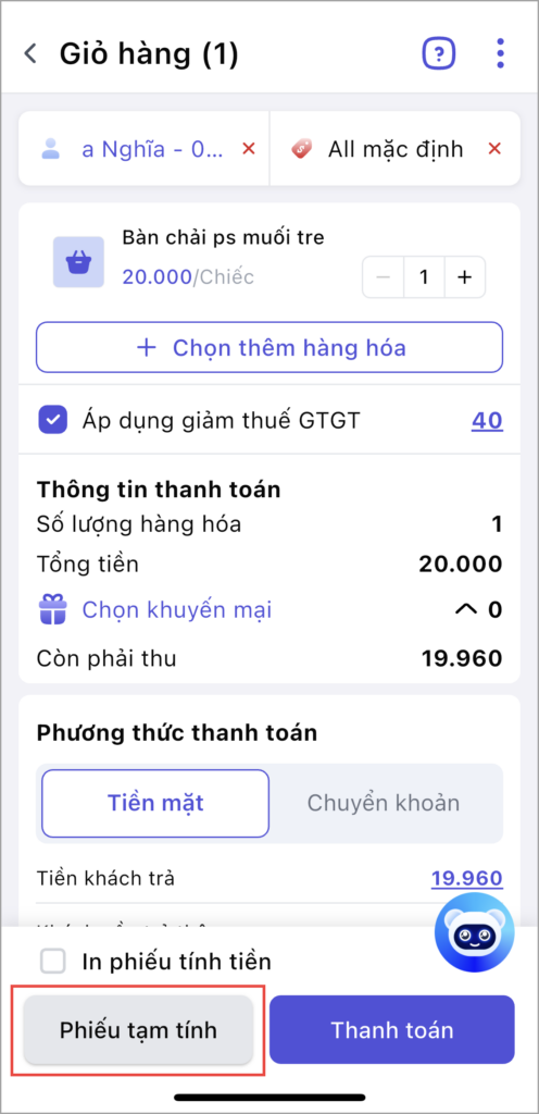 Bước 3. Kiểm tra và in phiếu tạm tính