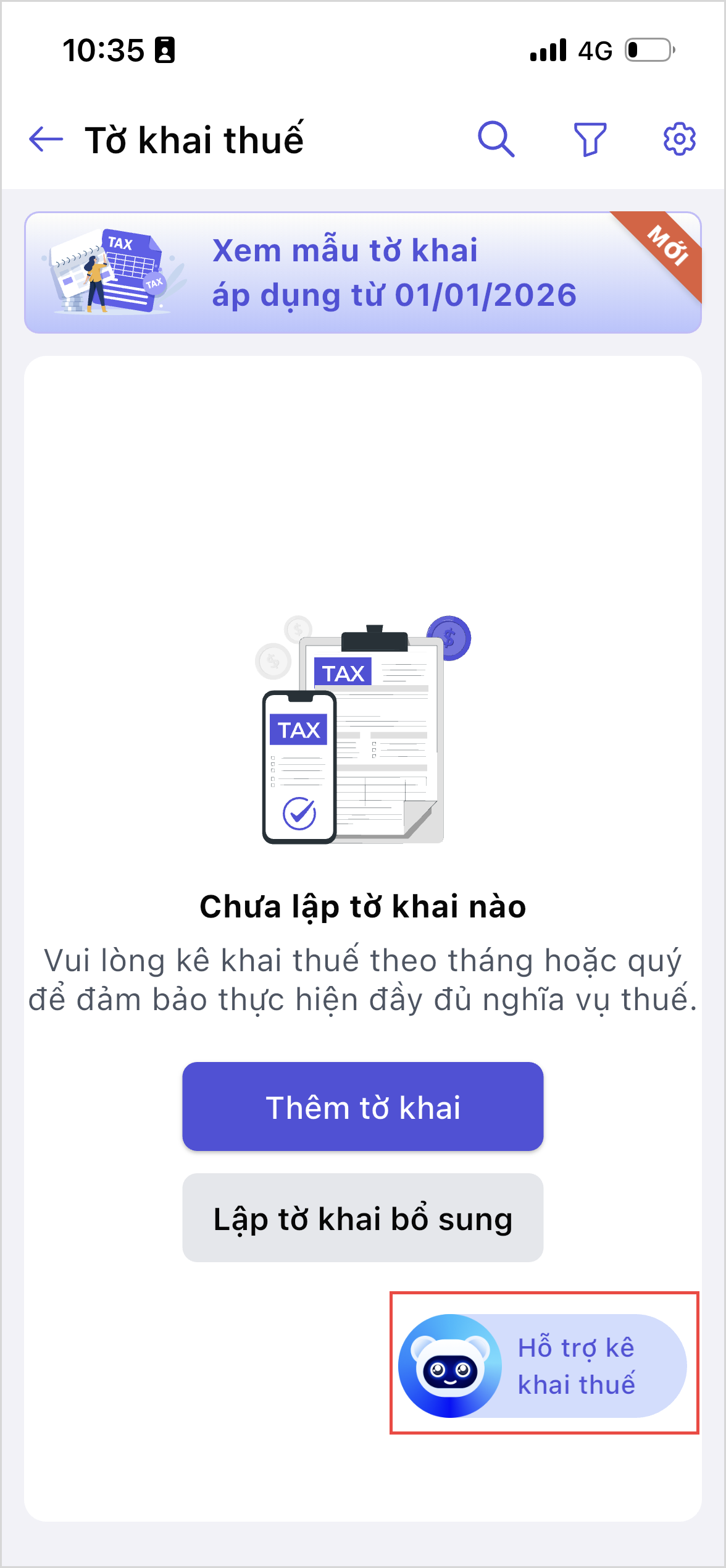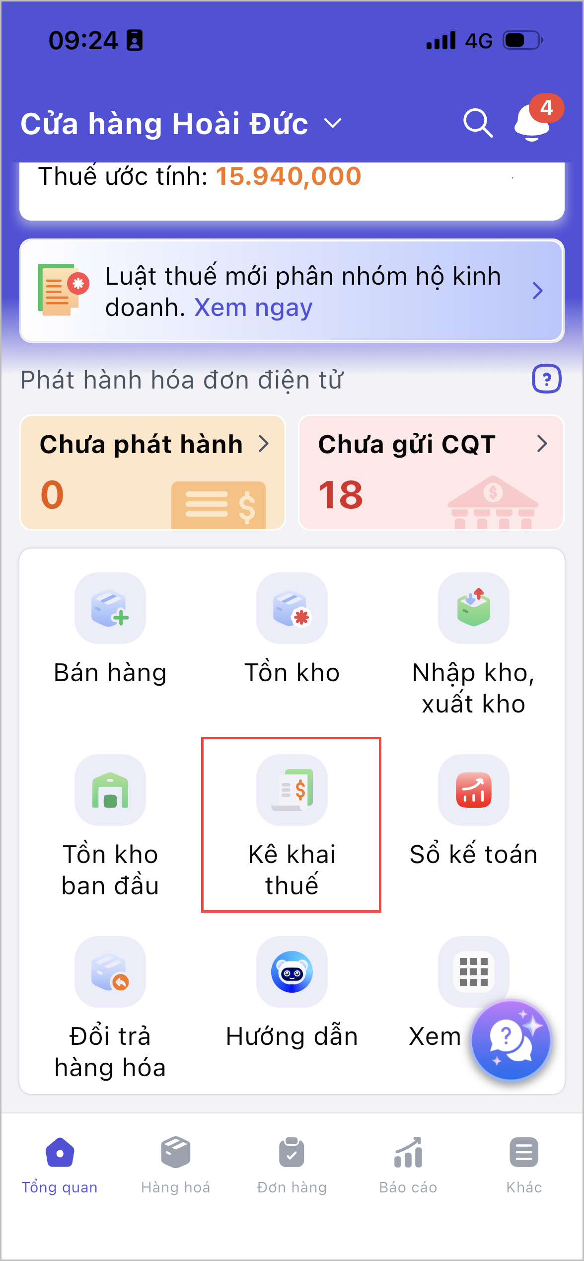 Bước 1: Tại màn hình tổng quan, chọn tính năng Kê khai thuế