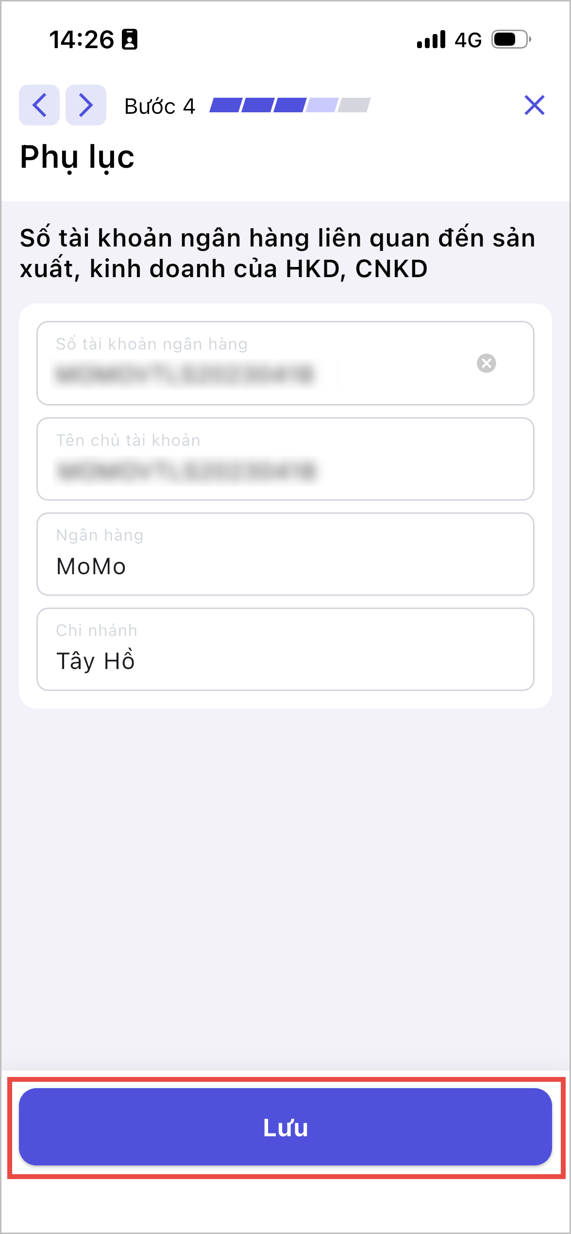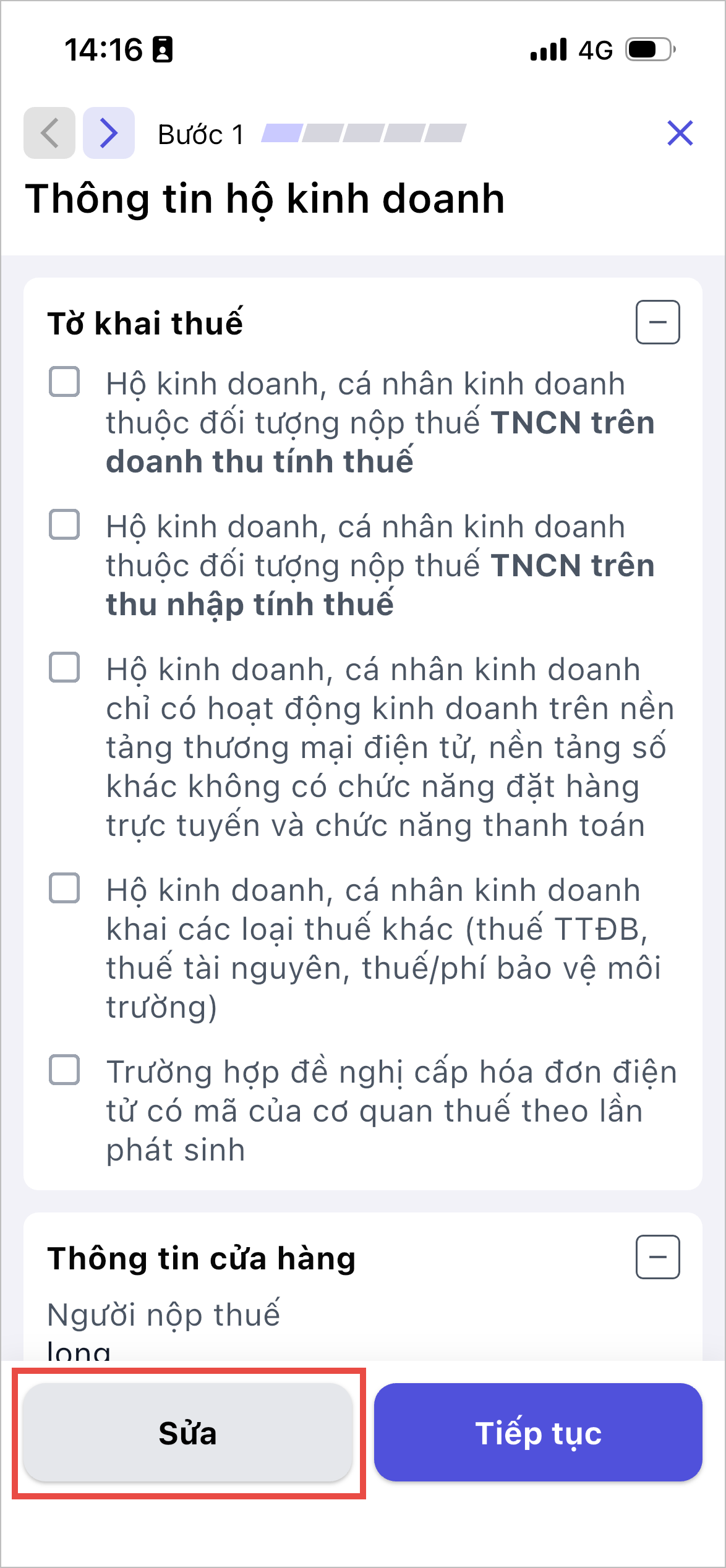 Trường hợp cần sửa lại thông tin hộ kinh doanh: quay lại Bước 1 và nhấn Sửa.