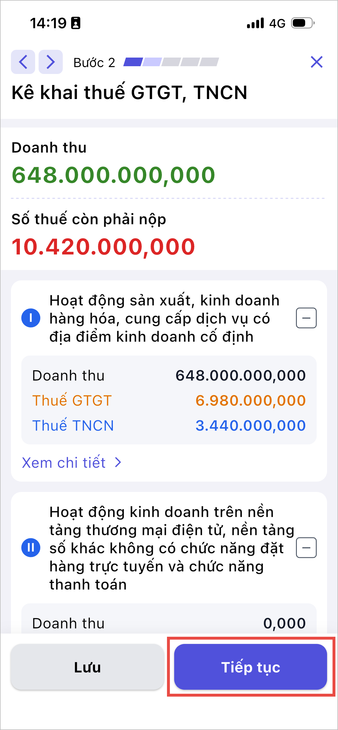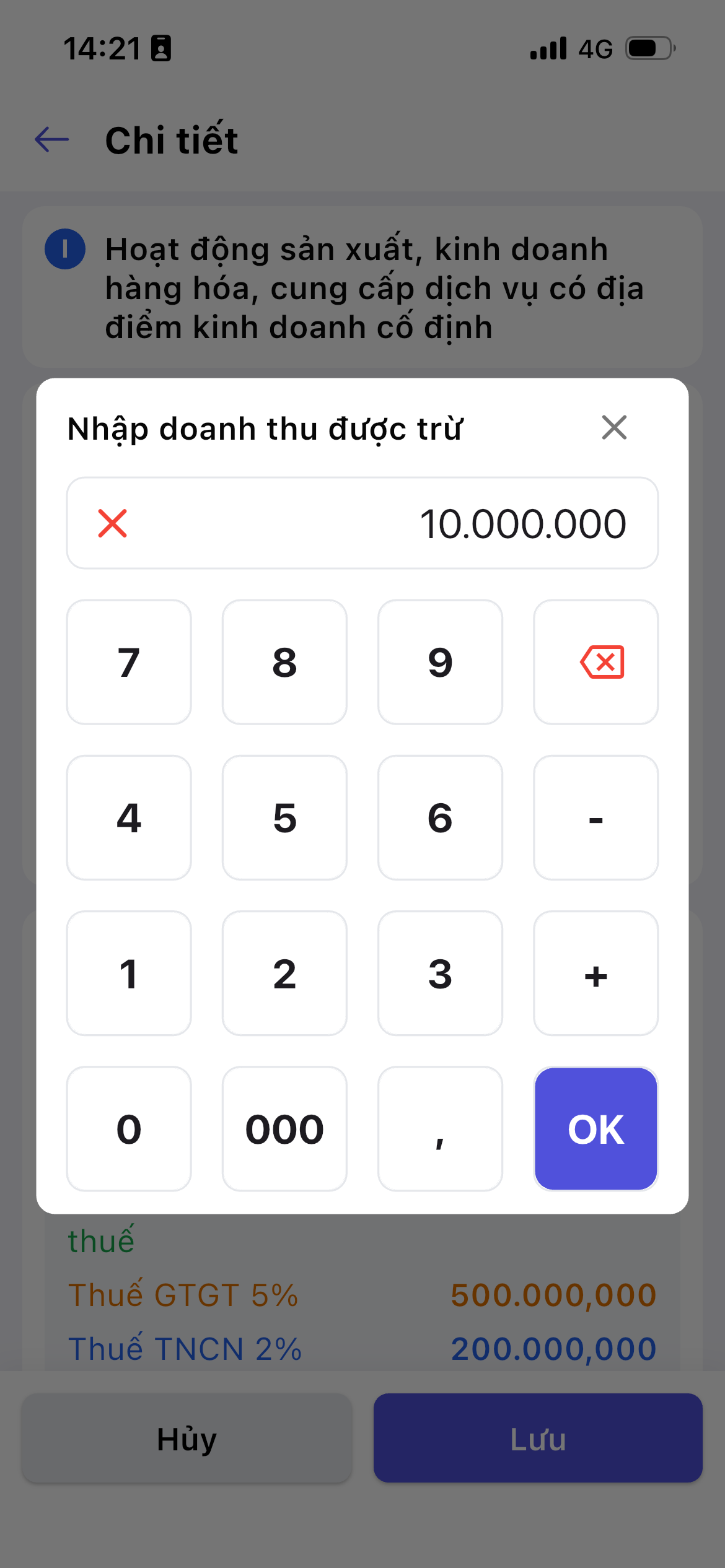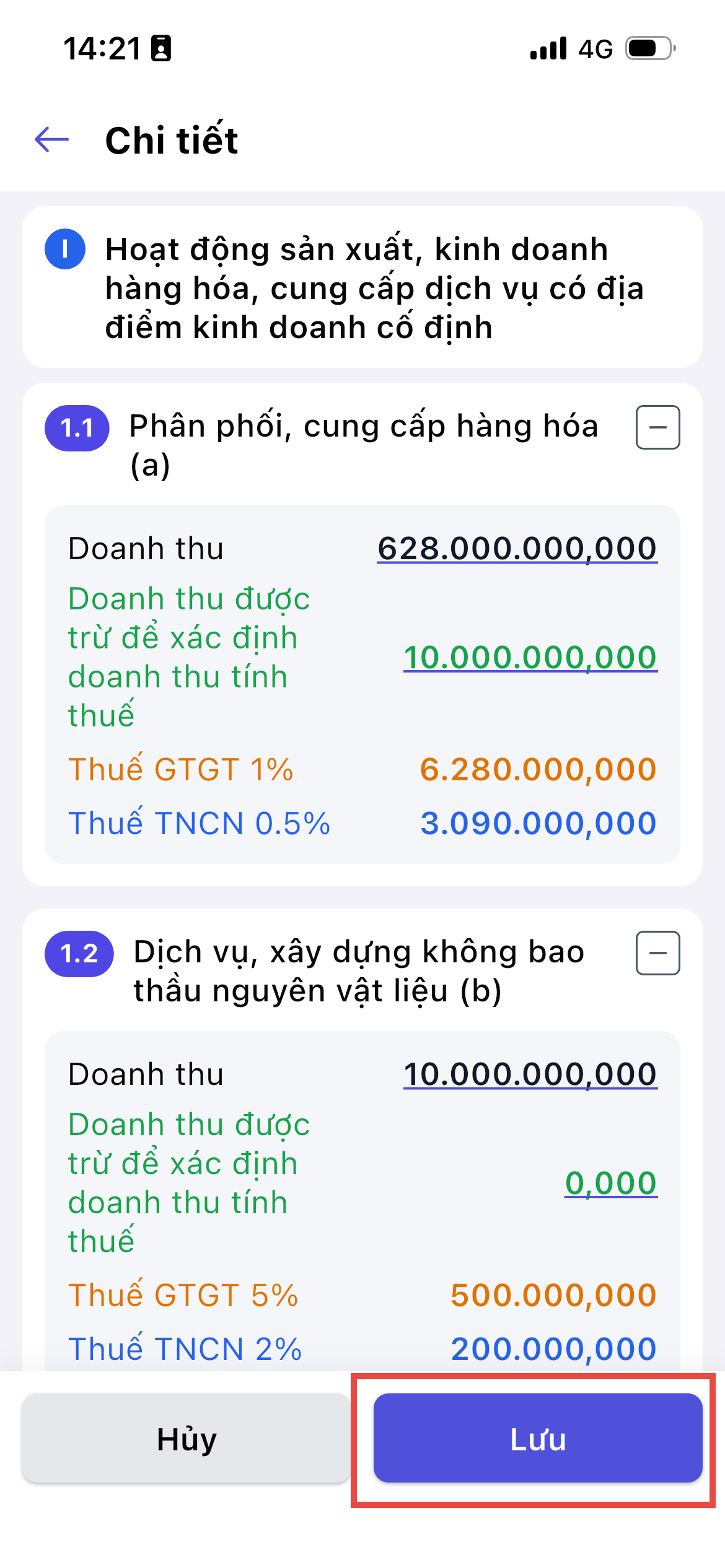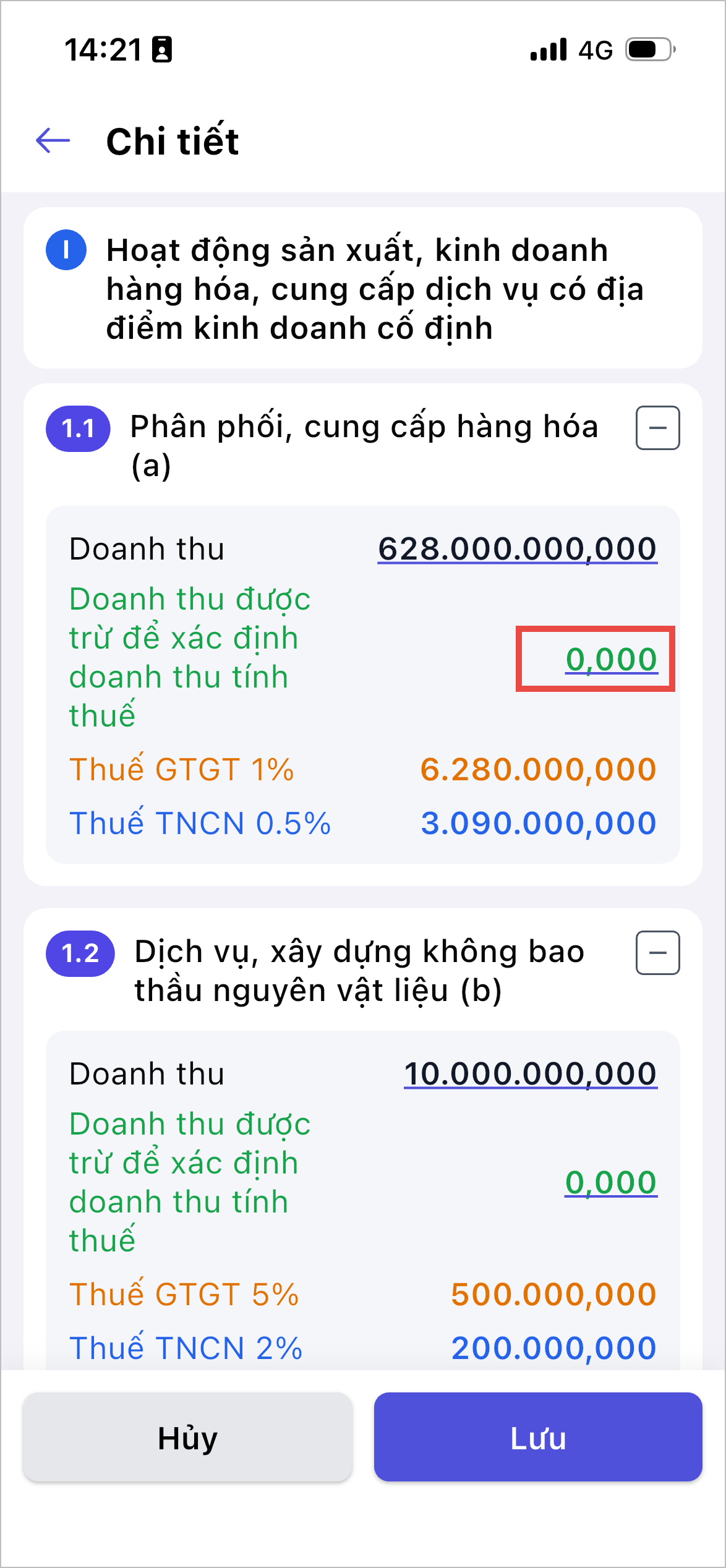 - Nhấn vào số tiền doanh thu cần sửa và nhập lại -> Hệ thống sẽ tự động tính toán lại thuế GTGT và thuế TNCN.