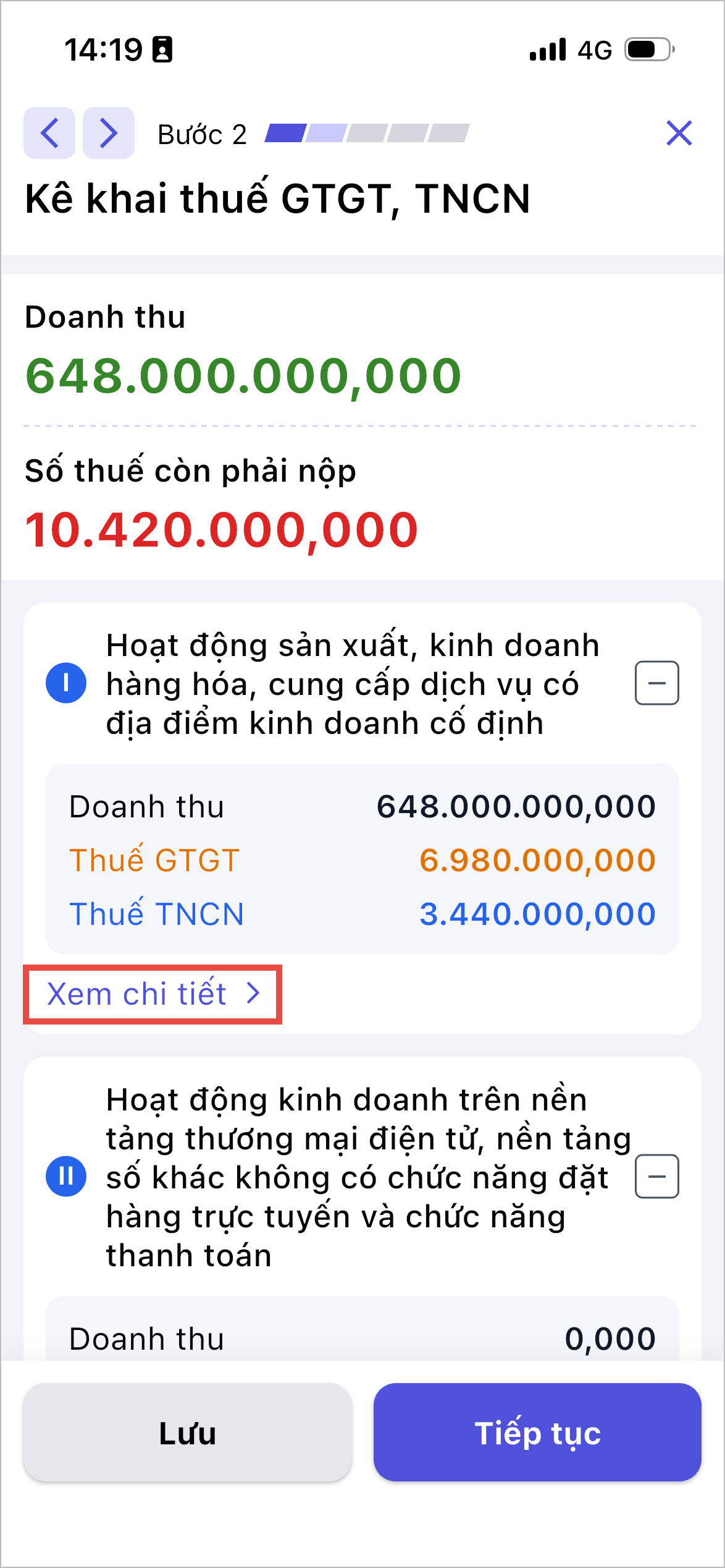 - Để sửa Doanh thu từ Hoạt động sản xuất, kinh doanh hóa hàng, dịch vụ, cung cấp dịch vụ có địa điểm kinh doanh cố định -> Nhấn Xem chi tiết