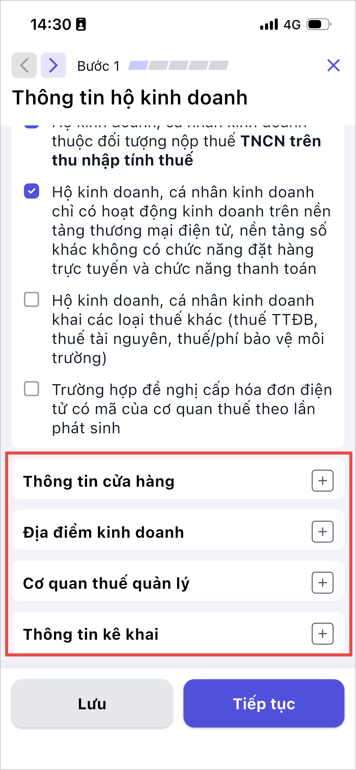 - Hộ kinh doanh, cá nhân kinh doanh thuộc nhóm đối tượng nộp thuế TNCN trên thu nhập tính thuế: Tích chọn khi cửa hàng thuộc nhóm đối tượng này, và KHÔNG tích chọn thêm Nhóm đối tượng nộp thuế TNCN trên doanh thu tính thuế.