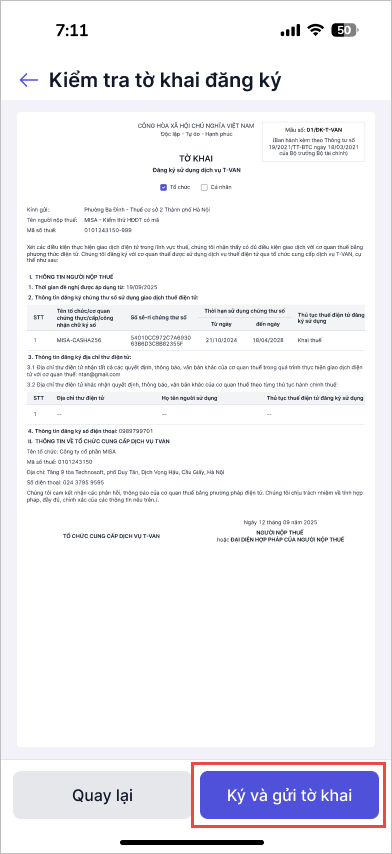 - Nhấn Ký và gửi tờ khai nếu mọi thứ đã chính xác.