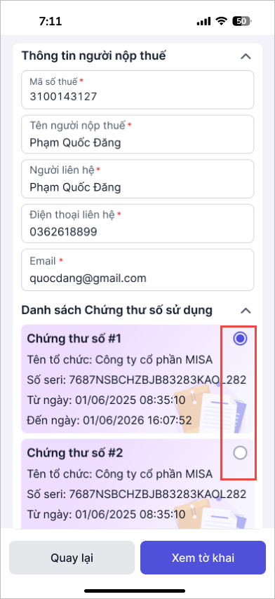 - Tích chọn chứng thư số mà bạn muốn sử dụng để ký tờ khai điện tử