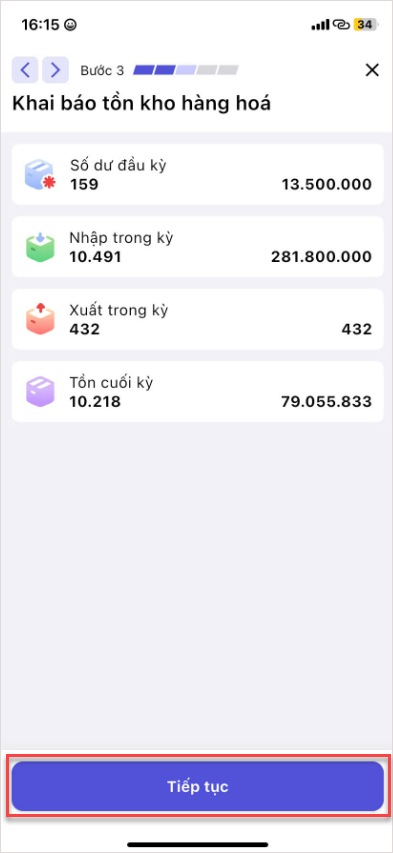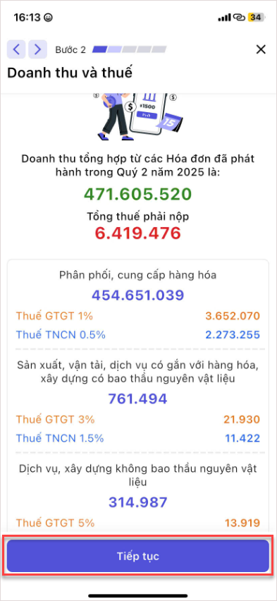 → Nhấn Tiếp tục để thực hiện kê khai theo các bước: