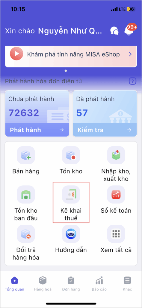 - Trên màn hình Tổng quan, chọn Kê khai thuế