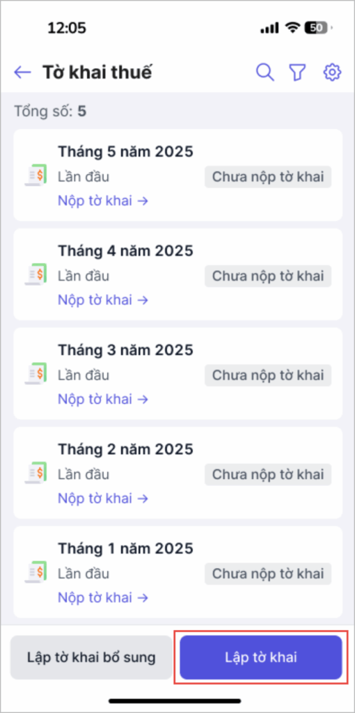 - Từ các lần sau, để lập tờ khai thuế → chọn Lập tờ khai