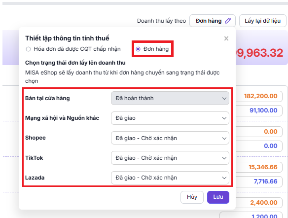 Có thể thiêt lập doanh thu tính thuế lấy theo Hóa đơn đã được CQT chấp nhận hoặc lấy theo Đơn hàng.