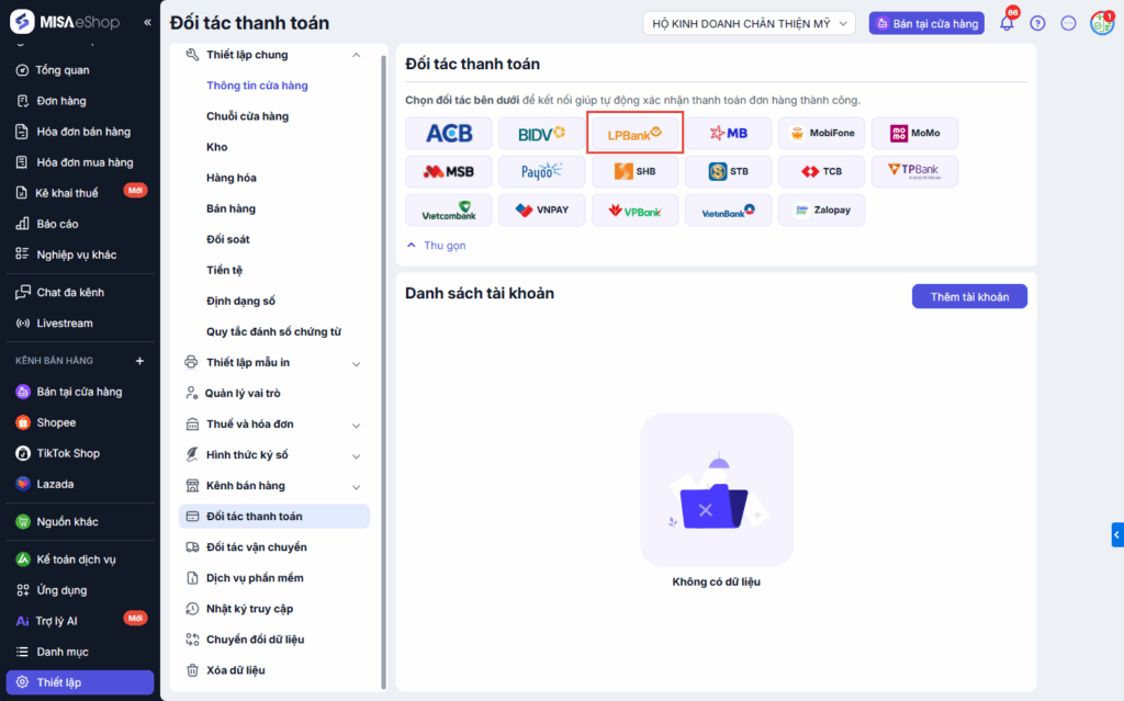 Bước 1: Tại màn hình quản lý, Chọn Thiết lập\Đối tác thanh toán.