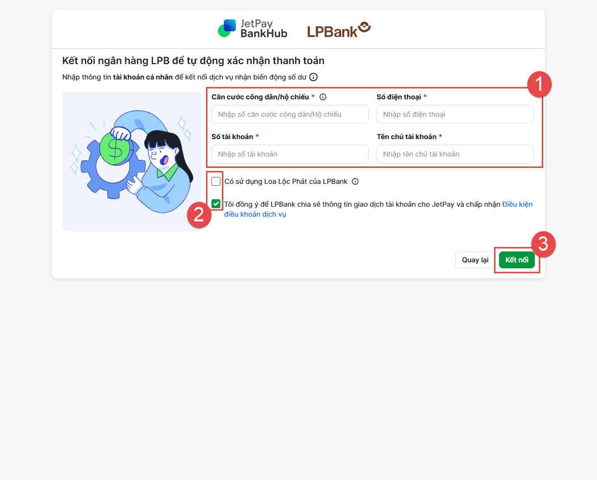 Giúp người dùng dễ dàng kết nối tài khoản ngân hàng Ngân hàng Thương mại Cổ phần Lộc Phát Việt Nam (LPBank) để thực hiện nhận giao dịch từ thanh toán trực tiếp khi bán hàng và các giao dịch khác.