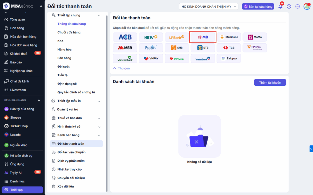 Bước 1: Tại màn hình quản lý, Chọn Thiết lập\Đối tác thanh toán.