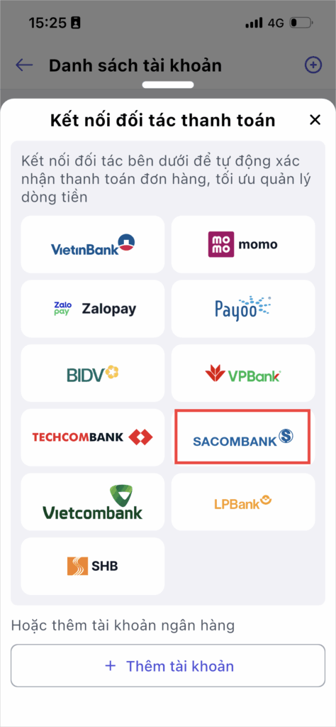 - Tại danh sách tài khoản ngân hàng đã kết nối, chọn biểu tượng