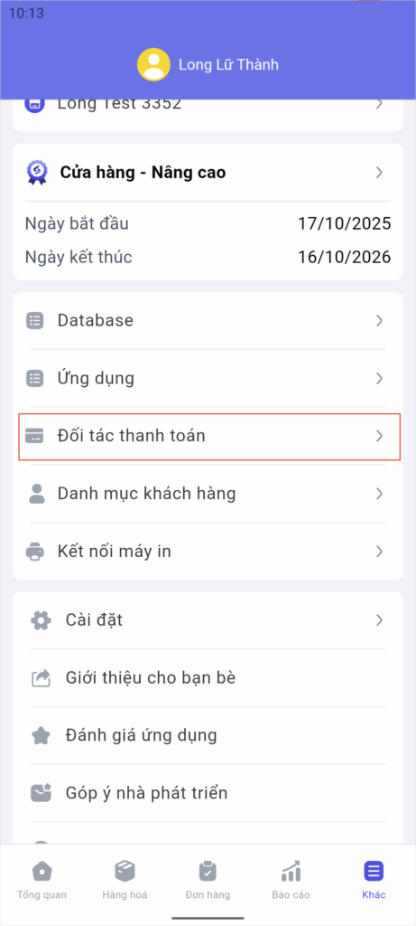 Bước 1: Tại màn hình tổng quan, chọn Khác/Đối tác thanh toán.