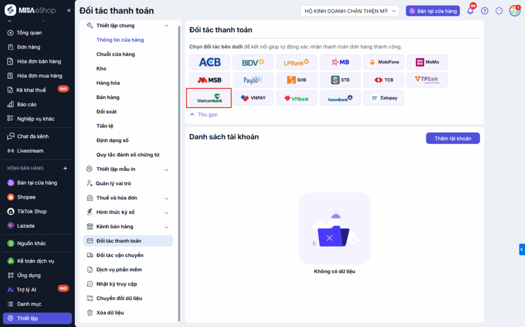 Bước 1: Tại màn hình quản lý, Chọn Thiết lập\Đối tác thanh toán.