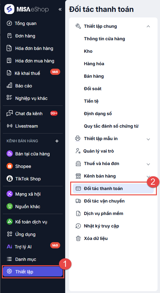 Bước 1: Tại màn hình quản lý, Chọn Thiết lập\Đối tác thanh toán.
