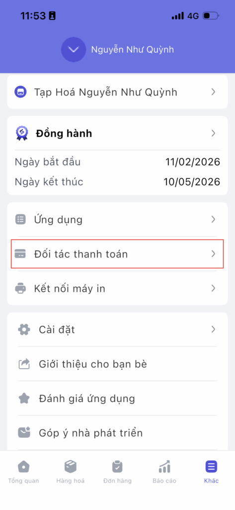 Bước 1: Tại màn hình quản lý, Chọn Thiết lập\Đối tác thanh toán.