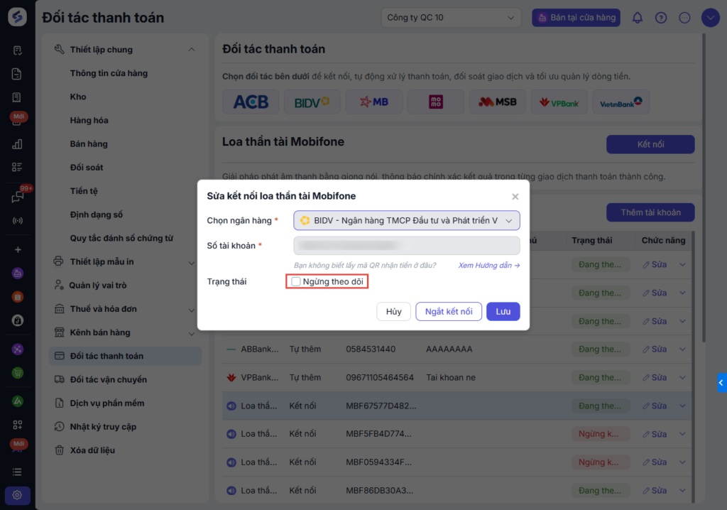 và thực hiện sửa. - Ngừng theo dõi: Khi tích chọn ngừng theo dõi, tài khoản gắn loa đó sẽ không còn hiển thị ở phần thanh toán trên trang bán tại cửa hàng.