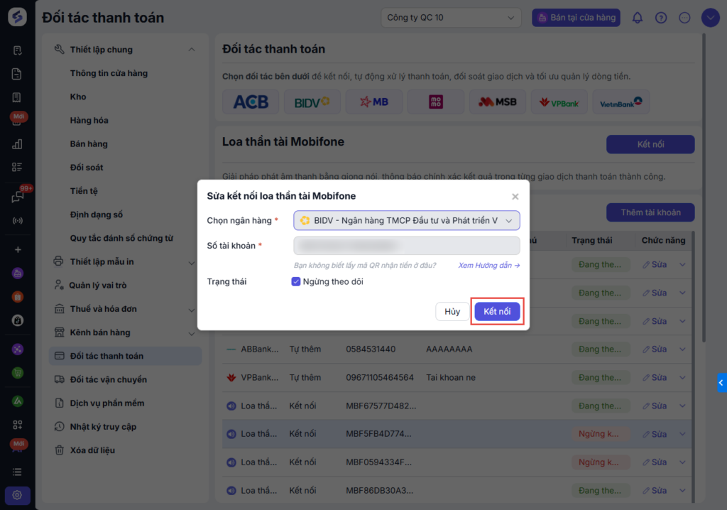 Điền thông tin tài khoản ngân hàng, nhấn Kết nối.