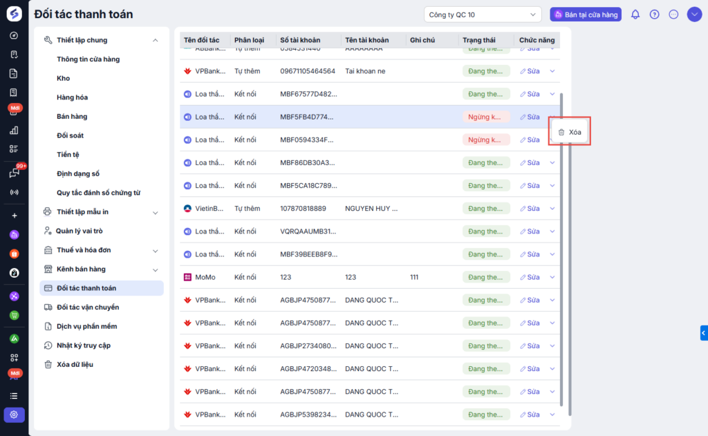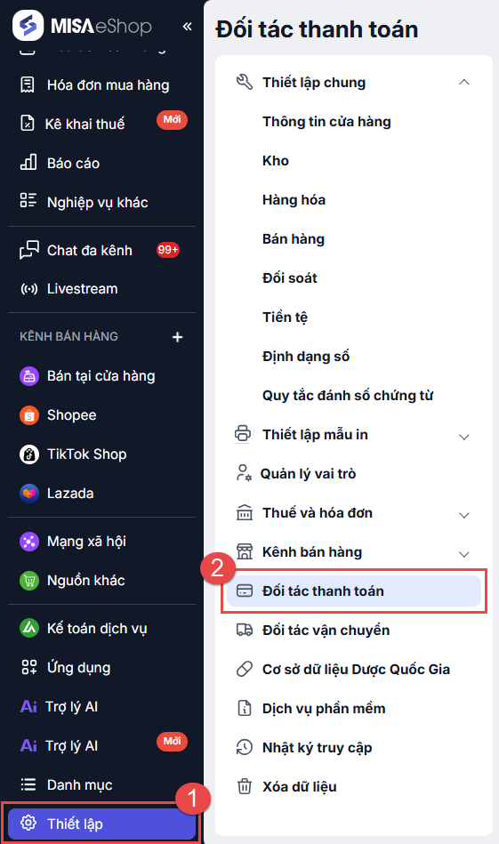 Tại màn hình quản lý, chọn Thiết lập\Đối tác thanh toán.
